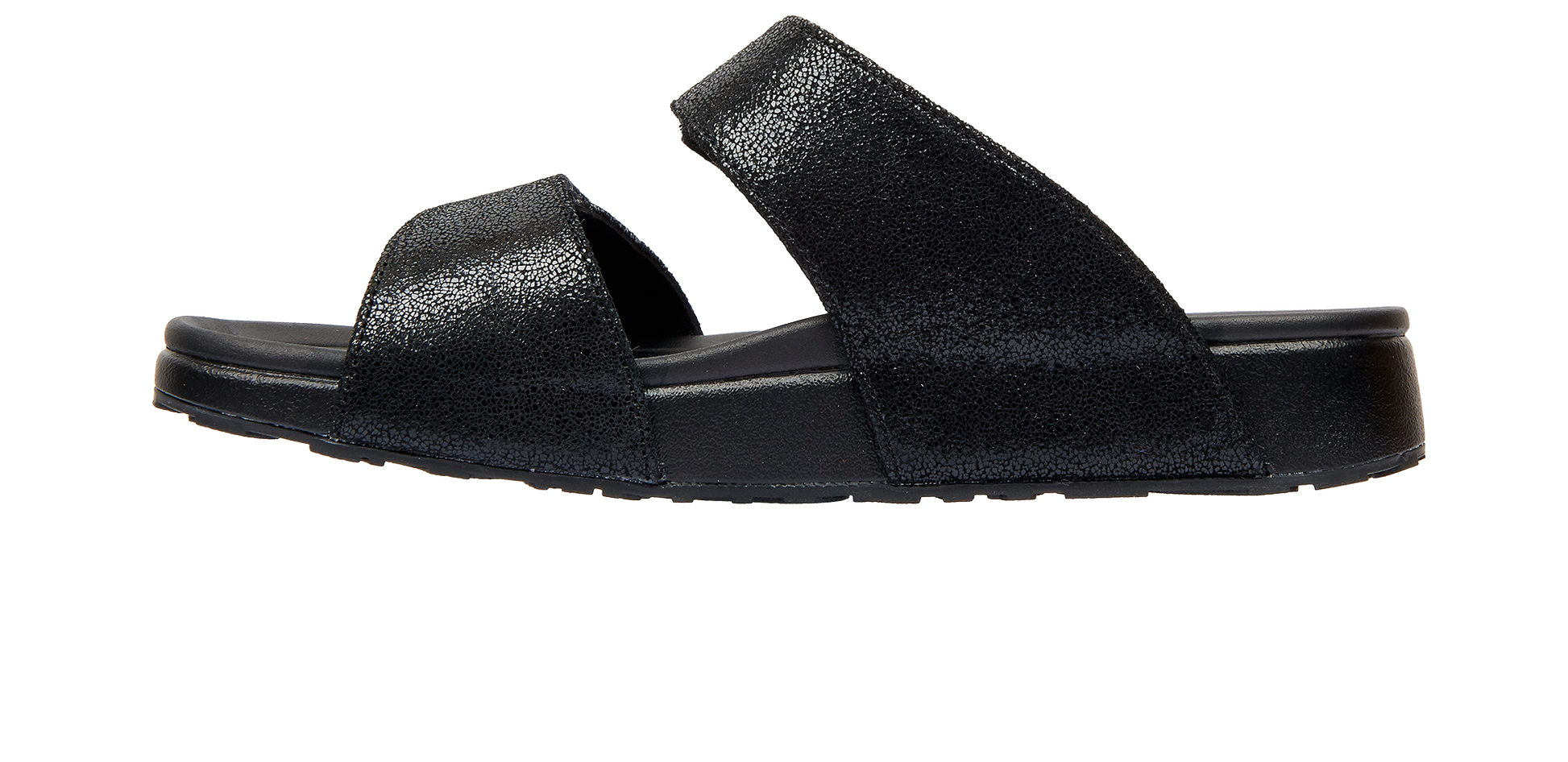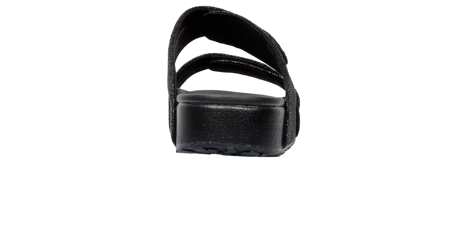 Pantofole in crosta di pelle scintillante e morbida fodera in tessuto. I cinturini regolabili in velcro garantiscono una calzata ottimale. Questa tecnologia presenta un plantare morbido e una suola ampia e morbida, che offre stabilità e ammortizzazione. Adatte a persone con schiena sensibile e con piedi e articolazioni esposti a stress quotidiano.