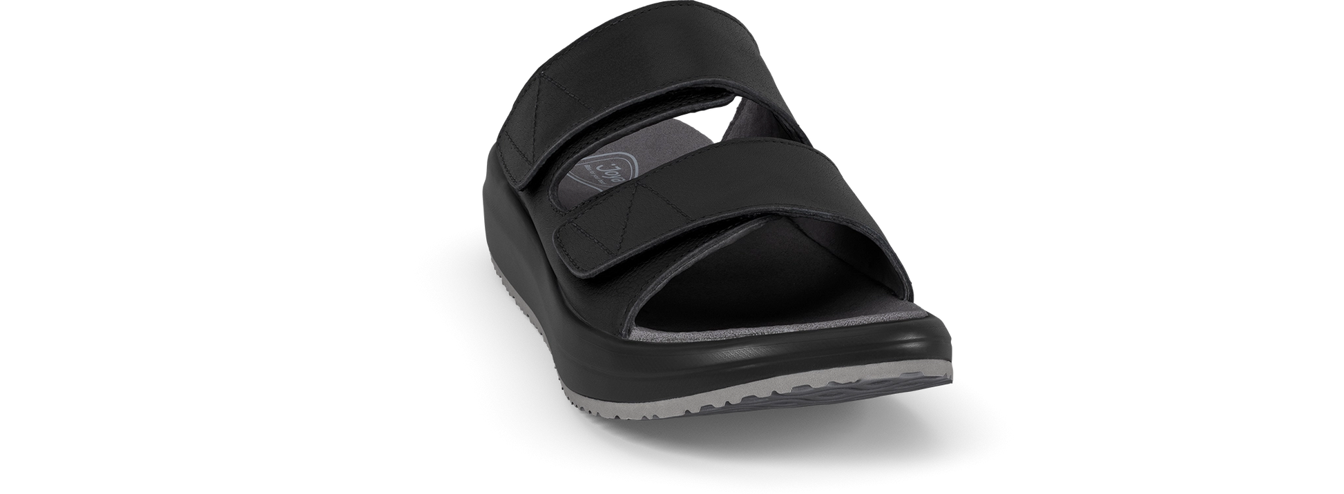 Sturdy full grain leather slide sandal with adjustable velcro straps on the instep and forefoot. Essential and easy going, your best everyday comfort choice for indoor and outdoor use. Featured with the Joya Senso sole technology that ensures excellent cushioning effect and balanced pressure distribution, and delivers optimum comfort and relief for your back muscles, joints and feet daily stress.